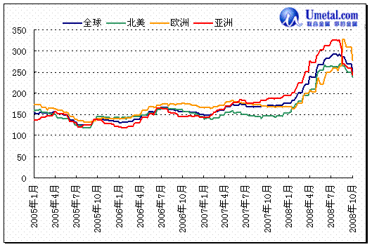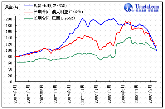 2008年第三季度开始,现货铁矿石价格持续下跌非常明显的反映了供需转变。10月以来现货印度铁矿石离岸价格(FOB)回落到80美金吨/吨左右,比08年第一季度最高点时下跌了47-50%。