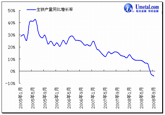 事实上,从2008年1月开始,中国生铁产量增长就一直程下降趋势,从1月的同比增长13%,2月的10%,到6月6.8%,直至8月的首次负增长-1.85%,由此带来的铁矿石需求减弱,将使先前预期的供求拐点提前到来。