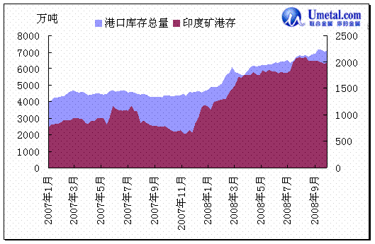 由于需求减弱,供应仍在持续增长,中国港口铁矿石库存顺理成章的大幅度增加,2008年第二季度开始,库存量几乎每天都在创造历史新高,根据10月的最新统计全国19个主要港口库存量为7100万吨,比07年同期增加65%。
