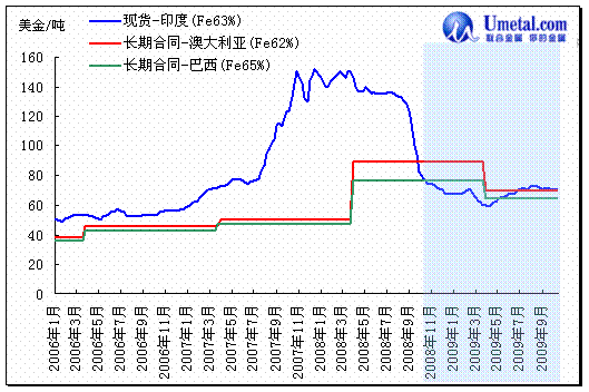 最引人注目的是,2008年澳大利亚铁矿石合同价格上涨79.88%,Fe 62%粉矿离岸价格(FOB)为89.6美金/吨,已比现货印度价格80美金/吨高12%,7年以来现货与长期合同价格水平首次倒置。
