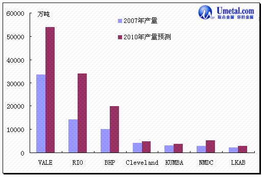而根据主要海外矿石供应商已宣布的产量计划,2008年VAL将增产2500万~3000万吨,力拓则要增加至少3500万吨。另外,08年5月澳大利亚FMG公司全面投产,预计FMG下半年将出口2000万吨铁矿石。