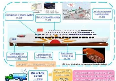 (图片说明: 新设计的渡轮在优化发动机方面将减排3%,采用(可充电电池,太阳能板和太阳能电池薄膜)可再生能源方面减排2%,采用岸上供电系统方面减排8%,优化推进效率方面实现减排18%,在优化船体方面减排2%,在采用(循环空气层润滑技术)降低摩擦阻力方面减排7%,以液化天然为渡船燃料方面实现减排25%,从而达到减少二氧化碳排放50%,氮氧化物排放90%,硫氧化物排放100%和颗粒物排放98%。)